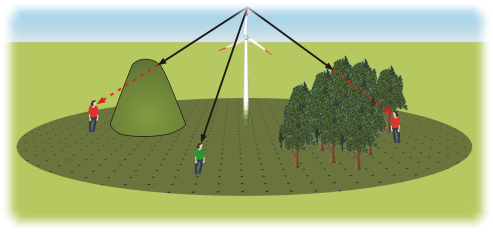 In der Abbildung links ist an den Standorten (Messpunkten) der roten Personen die Sichtbeziehung unterbrochen. Von beiden Standpunkten aus ist die WEA nicht zu sehen, sie sind also sichtverschattet. Am linken Standort wird die WEA von einem Hügel verdeckt und am rechten Standort wird die WEA von einem Wald verdeckt. Am Standort der grünen Person ist die Sichtbeziehung zur WEA intakt, die WEA also zu sehen. Dieser Standort ist also nicht sichtverschattet.
