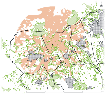 Auf bebauten Flächen (Wohn- und Industrieflächen) und in geschlossenen Waldflächen wird der Betrachter durch die Vielzahl hoher Elemente (Gebäude, Vegetation) daran gehindert, weiter entfernt liegende Objekte, hier die WEA, visuell zu erfassen (NOHL et al. 1993, PAUL et al. 2004). Wohn-, Industrie-, Wald- oder Gehölzflächen gelten deshalb pauschal als sichtverschattet. Die Analyseergebnisse fließen jeweils in eine einzelne Sichtverschattungskarte ein.